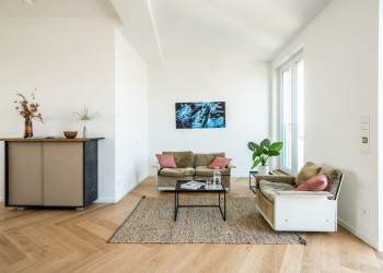 Bodentiefe Fenster erzeugen zusammen mit dem durchdachten Grundriss ein lichtverwöhntes Ambiente und die angrenzende atemberaubende Dachterrasse, sowie eine von zwei Loggien garantieren ausreichend Platz für rauschende Partys.