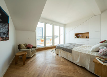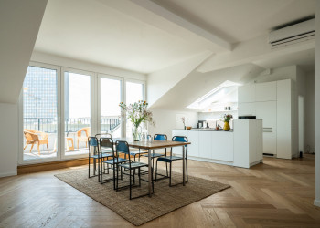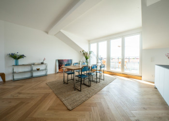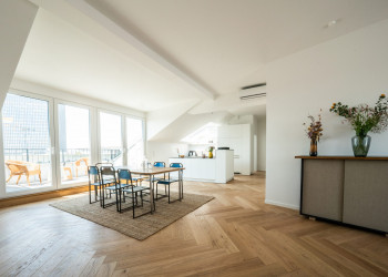 Lassen Sie sich von den absolut hochwertigen Ausstattungsdetails dieses funktionalen Luxus-Erlebnisses im Dachgeschoss eines 5-stöckigen Hauses überzeugen, das Sie bequem über einen Aufzug erreichen.
